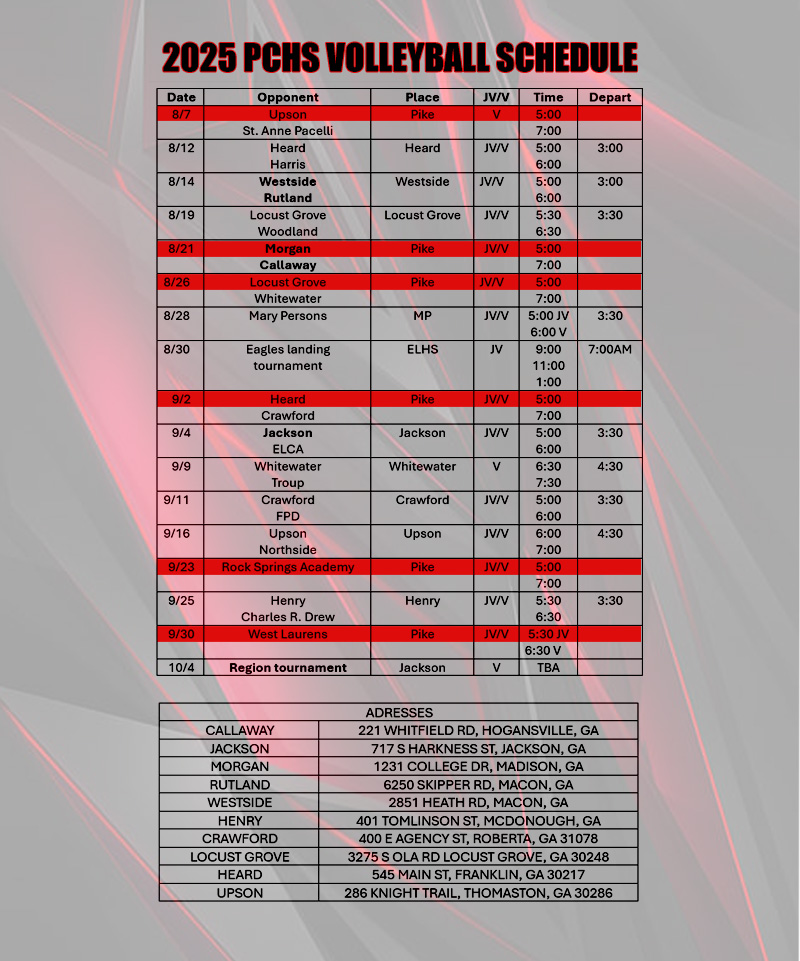 FALL VARSITY CHEERLEADING BOYS CROSS COUNTRY FLAG FOOTBALL FOOTBALL GIRLS CROSS COUNTRY SOFTBALL VOLLEYBALL JR. VARSITY CHEERLEADING FLAG FOOTBALL FOOTBALL (B & C TEAMS) SOFTBALL VOLLEYBALL WINTER VARSITY BOYS BASKETBALL CHEERLEADING DANCE TEAM GIRLS BASKETBALL SWIMMING WRESTLING JR. VARSITY BOYS BASKETBALL WRESTLING SPRING VARSITY BASEBALL BASS FISHING BOYS GOLF BOYS SOCCER BOYS TRACK GIRLS GOLF GIRLS SOCCER GIRLS TRACK GYMNASTICS TENNIS JR. VARSITY BASEBALL BOYS SOCCER GIRLS SOCCER GYMNASTICS NINTH GRADE BASEBALL RESOURCES PCS ATHLETIC DOCUMENTS ATHLETIC SAFETY POLICY PCHS NIL GUIDELINES HIGH SCHOOL SPORTS PACKET MIDDLE SCHOOL SPORTS PACKET GHSA INFORMATION GHSA HOME GHSA RULES CLINIC LAY COACH CERTIFICATION ATHLETIC LINKS CONCUSSION ASSESSMENTS NAIA ELIGIBILITY NCAA ELIGIBILITY NFHS HOME SCORE ATLANTA SHOP PIKE COUNTY J.V. VOLLEYBALL COACHING STAFF Layla EubanksHead Coach BE A PIRATE! GOLDEN PIRATE PASS © 2025 Pike County Athletics. All Rights Reserved.